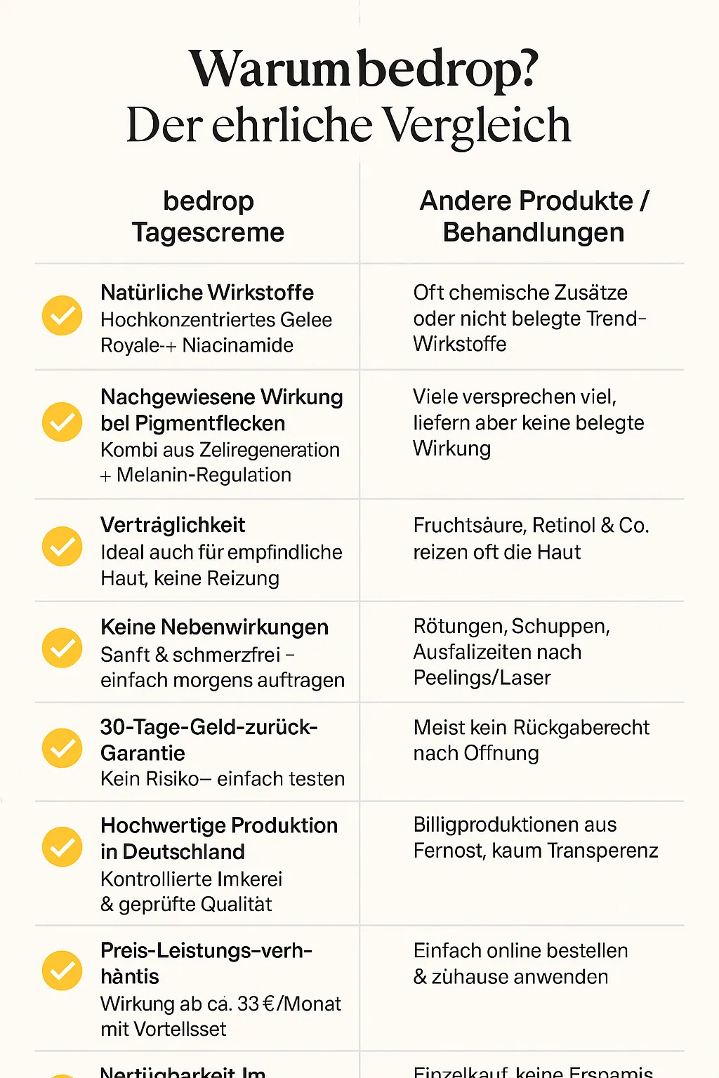 Die Wirksamkeit von bedrop, wie auf dieser Website beschrieben, kann variieren und ist nicht garantiert. Erfahrungsberichte und Ergebnisse, die hier dargestellt werden, sind individuell und können nicht als typisch oder garantiert angesehen werden.
