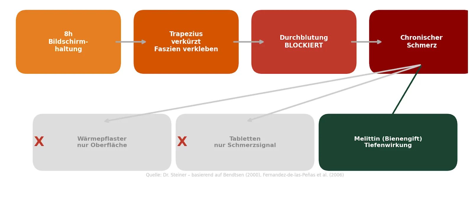 "Das Zusammenspiel dieser Wirkstoffe ist entscheidend. Melittin aktiviert die Tiefendurchblutung, Teufelskralle hemmt die Entzündung, Menthol bringt sofortige Kühlung, Kampfer und Rosmarin verstärken die Zirkulation, und Jojoba transportiert alles dorthin, wo es wirken muss. Das ist kein einzelner Wirkstoff – das ist ein System."– Dr. Katharina Steiner, Neurologin