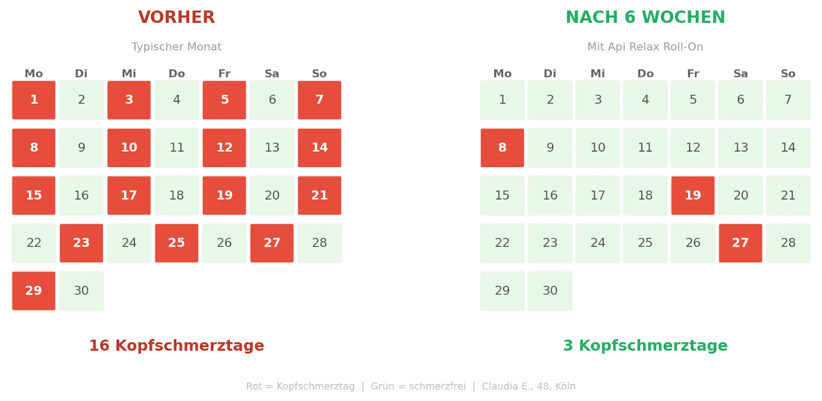 "Ich habe nach vier Wochen gedacht, es ist geschafft, und den Roll-On weggelegt. Großer Fehler. Innerhalb von zehn Tagen kamen die Kopfschmerzen zurück. Seitdem ist er fester Bestandteil meiner Abendroutine – und ich bin seit Monaten nahezu beschwerdefrei."