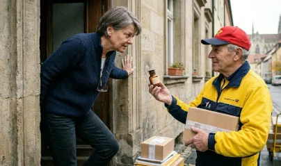 Monika schaut ihm nach. Denkt an die schlaflose Nacht. An die 6.609 Euro auf dem Bildschirm. An den Satz: „Wir managen den Zustand." An die kleine braune Dose, die der Postbote aus der Jackentasche gezogen hat, so selbstverständlich wie Zähneputzen.