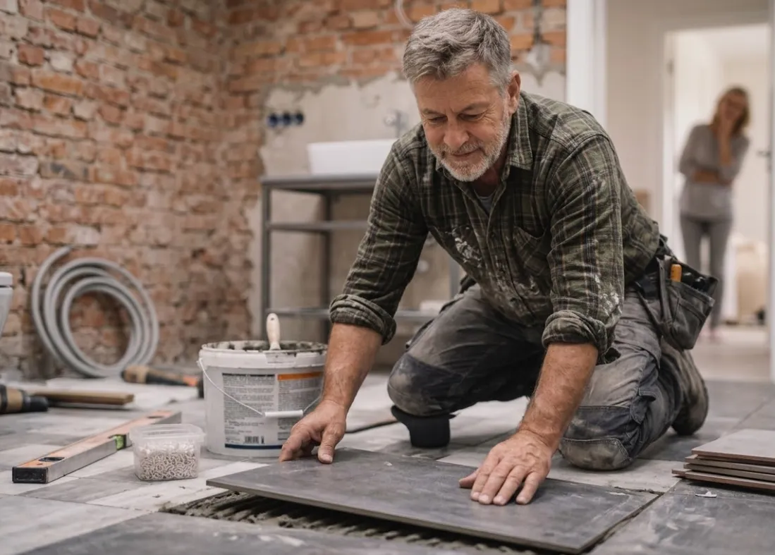 34 Jahre auf den Knien. Badezimmer, Küchen, Treppenhäuser. Klaus hat in seiner Karriere geschätzte 180.000 Fliesen gelegt – jede einzelne auf hartem Untergrund, in engen Winkeln, mit dem Körpergewicht auf den Knien.