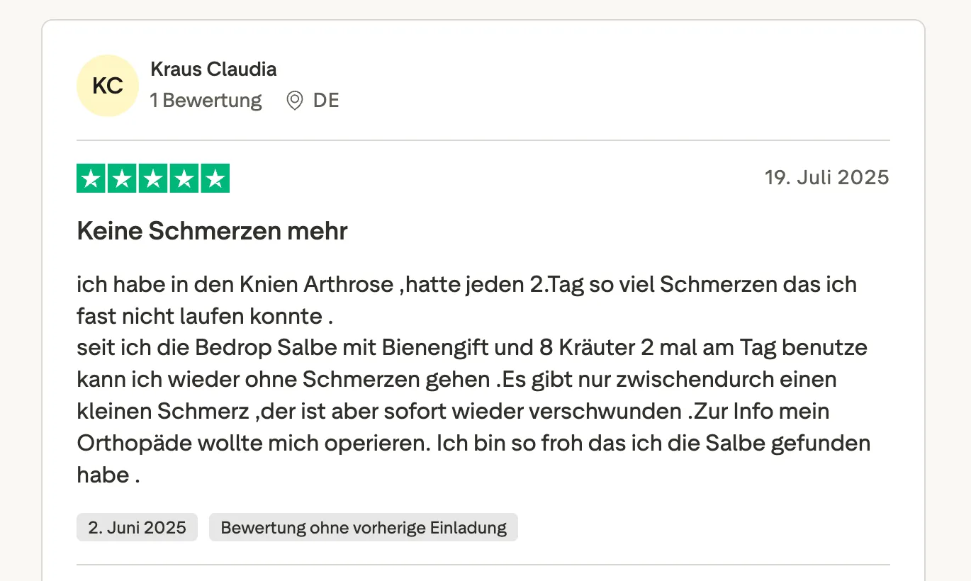 Viele Anwender berichten, dass sie nach Jahren voller Tabletten und Salben zum ersten Mal spürbar erleichtert sind. Typisch sind Aussagen wie: „Treppensteigen geht wieder leichter“ oder „Ich kann endlich wieder eine ganze Runde spazieren, ohne dauernd stehenzubleiben.“ Die Wirkung entsteht durch die besondere Kombination aus Bienengift und Pflanzenextrakten, die nicht nur die Oberfläche pflegen, sondern tief ins Gelenkumfeld wirken. Der Ansatz zielt darauf ab, entzündliche Prozesse zu beruhigen, Schwellungen zu mindern und die Schmerzwahrnehmung zu regulieren.