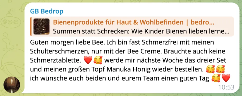 Die Bee Cream wirkt kumulativ: jede Anwendung baut auf der vorigen auf. bedrop empfiehlt ausdrücklich mindestens 6 Wochen, für nachhaltige Ergebnisse idealerweise 6 Monate. Das ist der Zeitraum, den Monika gebraucht hat. Den Thomas gebraucht hat. Den die meisten brauchen.