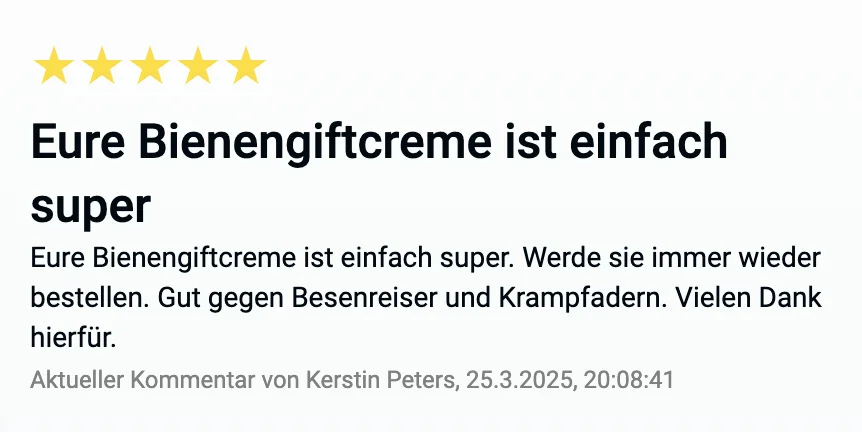 "Ich hatte mich schon fast damit abgefunden, dass ich für immer unter langen Hosen verstecken würde. Die Bienengift-Creme von bedrop war mein letzter Versuch - und was soll ich sagen? Es war die beste Entscheidung, die ich hätte treffen können! Endlich bin ich frei von Besenreisern und voller Lebensfreude."
