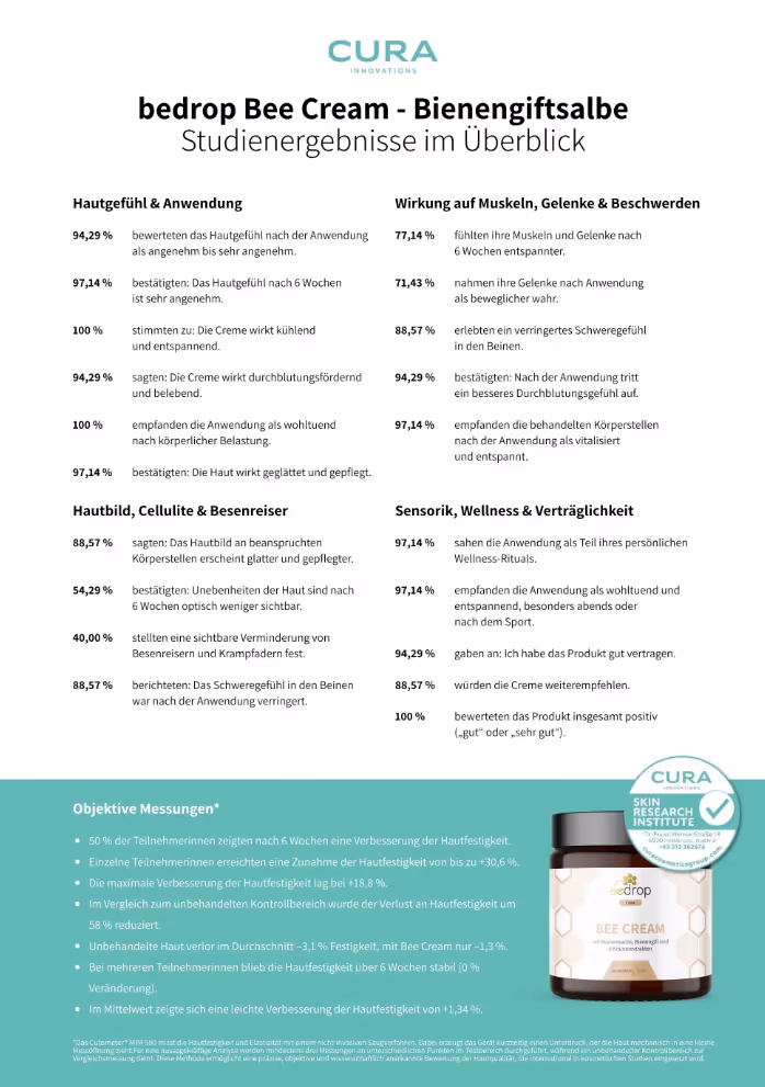 Millionen Menschen nutzen Bienengift-Produkte weltweit. Seit Jahrzehnten. Die Studien zeigen: Keine Hautreizung. Keine Nebenwirkungen.