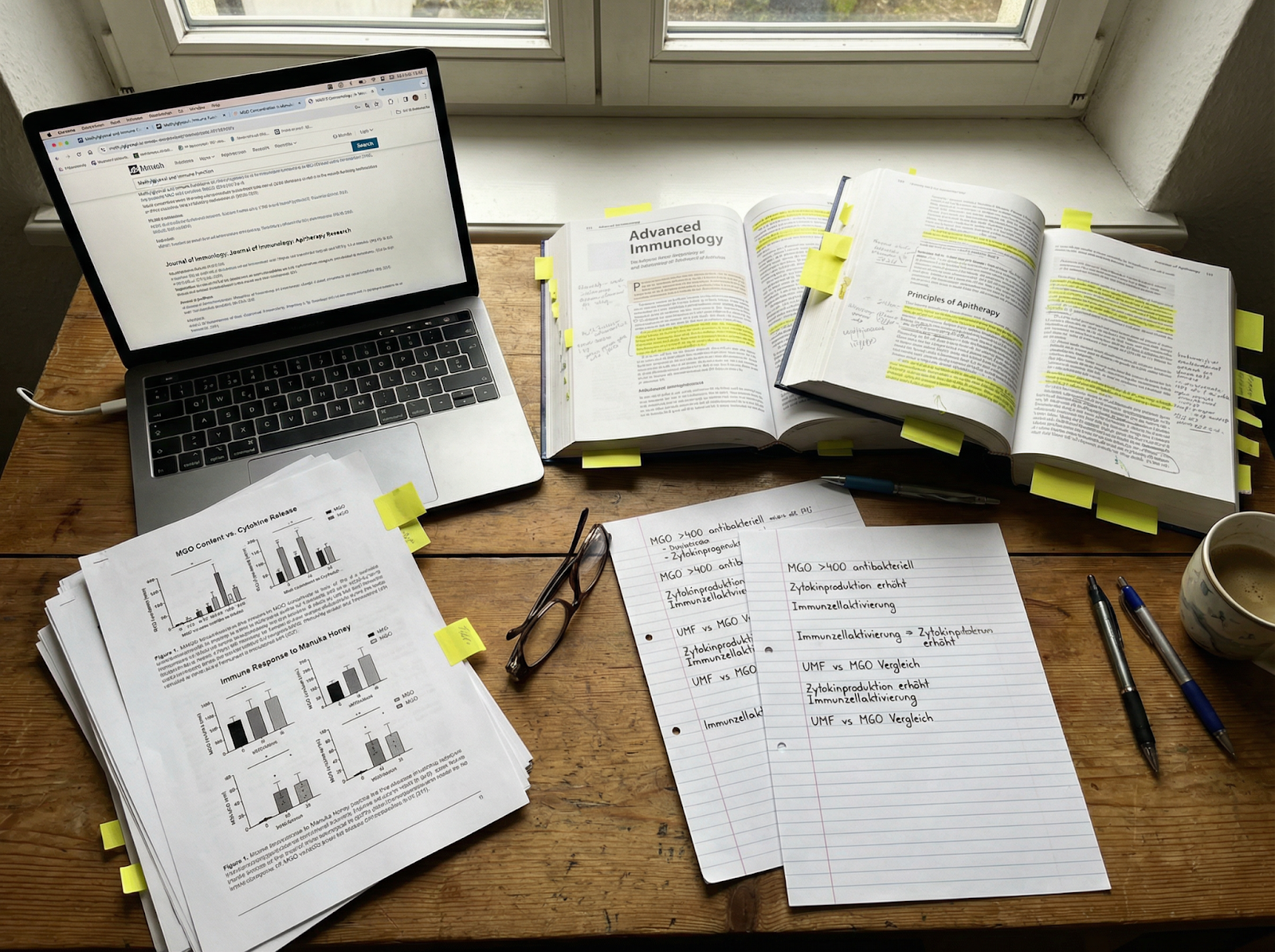 MGO als Hauptwirkstoff: Mavric, E. et al. (2008) 'Identification and quantification of methylglyoxal as the dominant antibacterial constituent of Manuka (Leptospermum scoparium) honeys from New Zealand', Molecular Nutrition & Food Research, 52(4), S. 483-489.