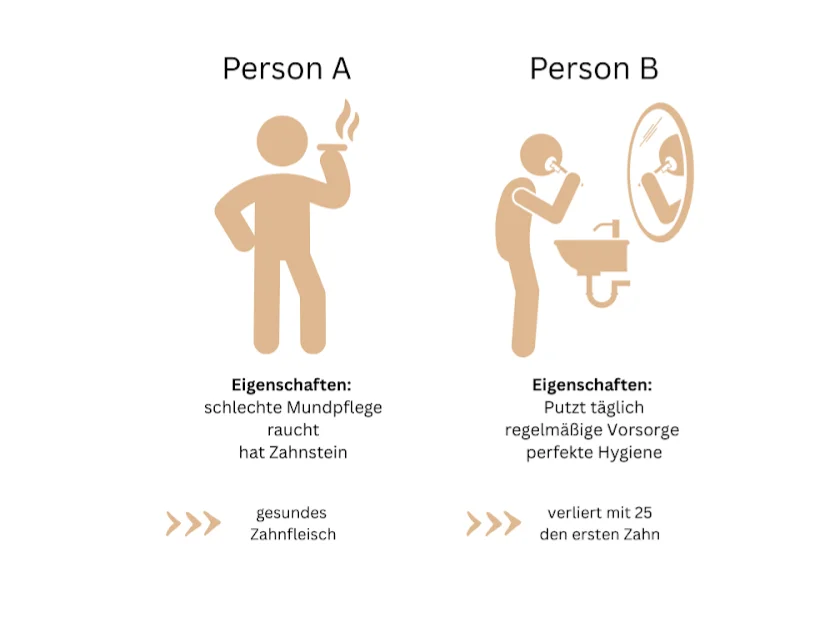 Der Grund ist folgender: Ihre Gene programmieren Ihr Immunsystem vor. Manche Menschen haben eine Überreaktion eingebaut, die bei Bakterienkontakt das eigene Zahnfleisch und den Knochen angreift, auch bei perfekter Mundpflege.