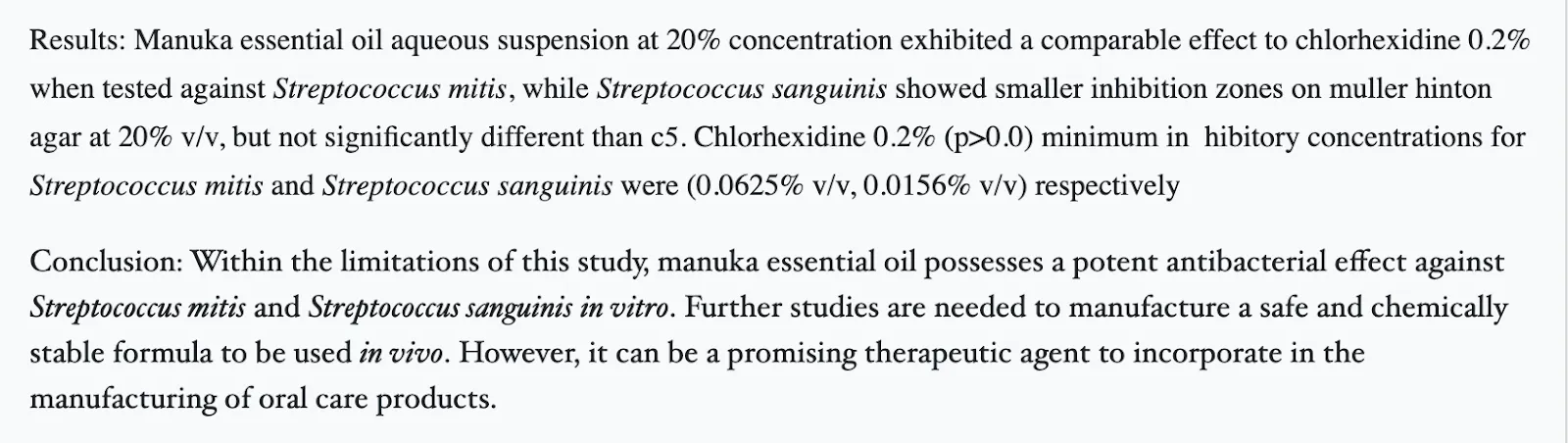 Die Forscher testeten Manuka-Öl direkt gegen Streptococcus mitis und Streptococcus sanguinis - genau die Bakterien, die den ersten Zahnbelag verursachen.