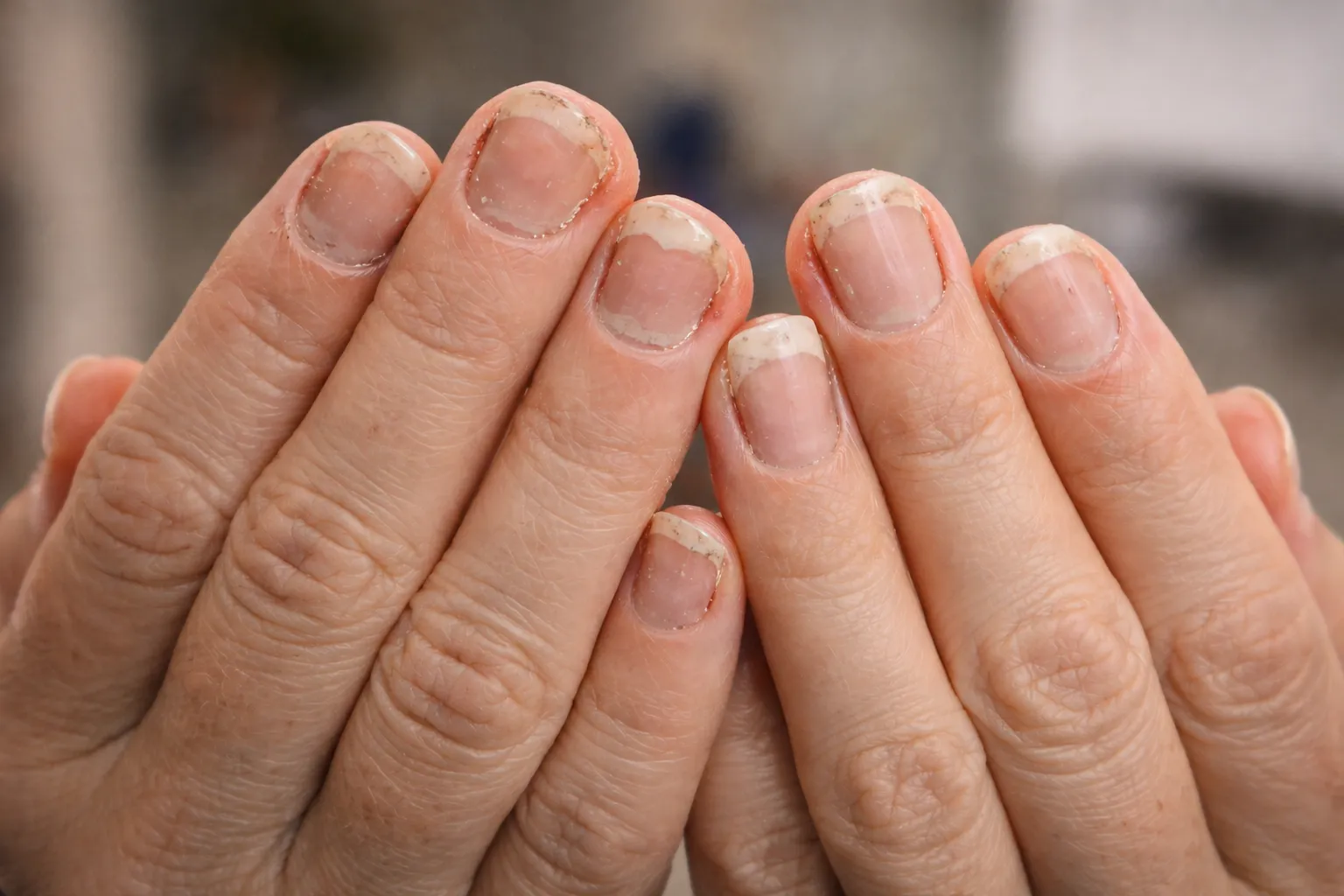 Brüchige Nägel, dünne Nägel, verfärbte Nägel, eingerissene Nägel.
