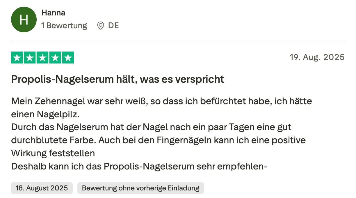 Wichtig: Das Propolis-Nagelserum ist kein Arzneimittel und ersetzt keine ärztliche Behandlung. Es kann Sie jedoch auf natürliche Weise dabei unterstützen, Ihre Nägel wieder ins Gleichgewicht zu bringen.