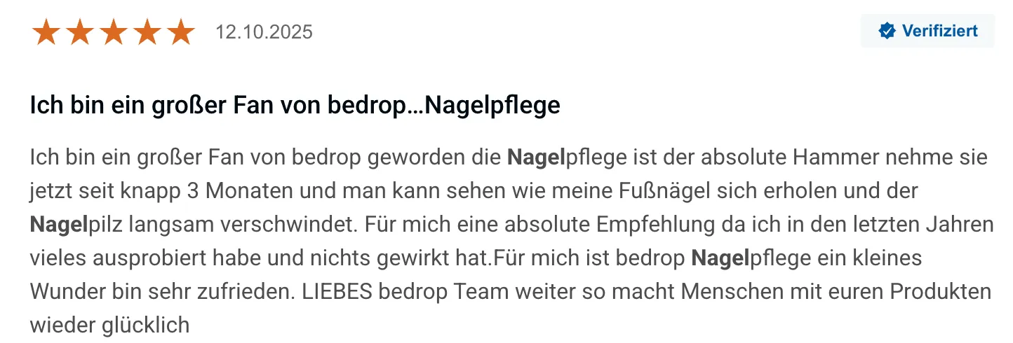 Viele Anwender:innen berichten, dass sie nach langen Jahren voller Cremes und Tabletten zum ersten Mal eine echte Veränderung spüren. Typisch sind Aussagen wie: „Meine Nägel sehen endlich wieder gesund aus“ oder „Ich kann wieder barfuß ins Schwimmbad, ohne mich zu schämen.“