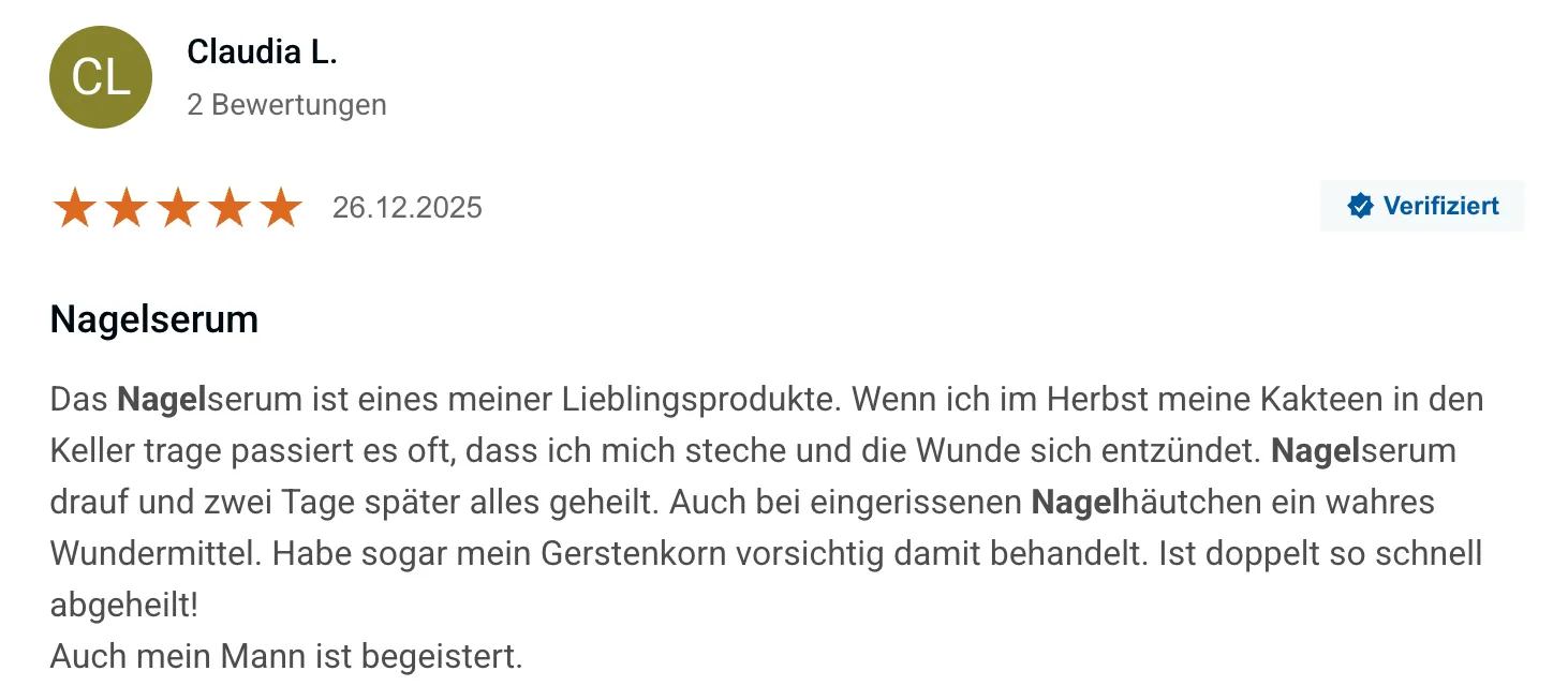 Durch die flüssige Konsistenz gelangt das Serum auch in kleinste Spalten und unter den Nagelrand, wo Pilze besonders hartnäckig sind. Auf diese Weise wirkt es nicht nur als kosmetische Unterstützung bei Nagelpilz, sondern stärkt auch nachhaltig die natürliche Nagelpflege.