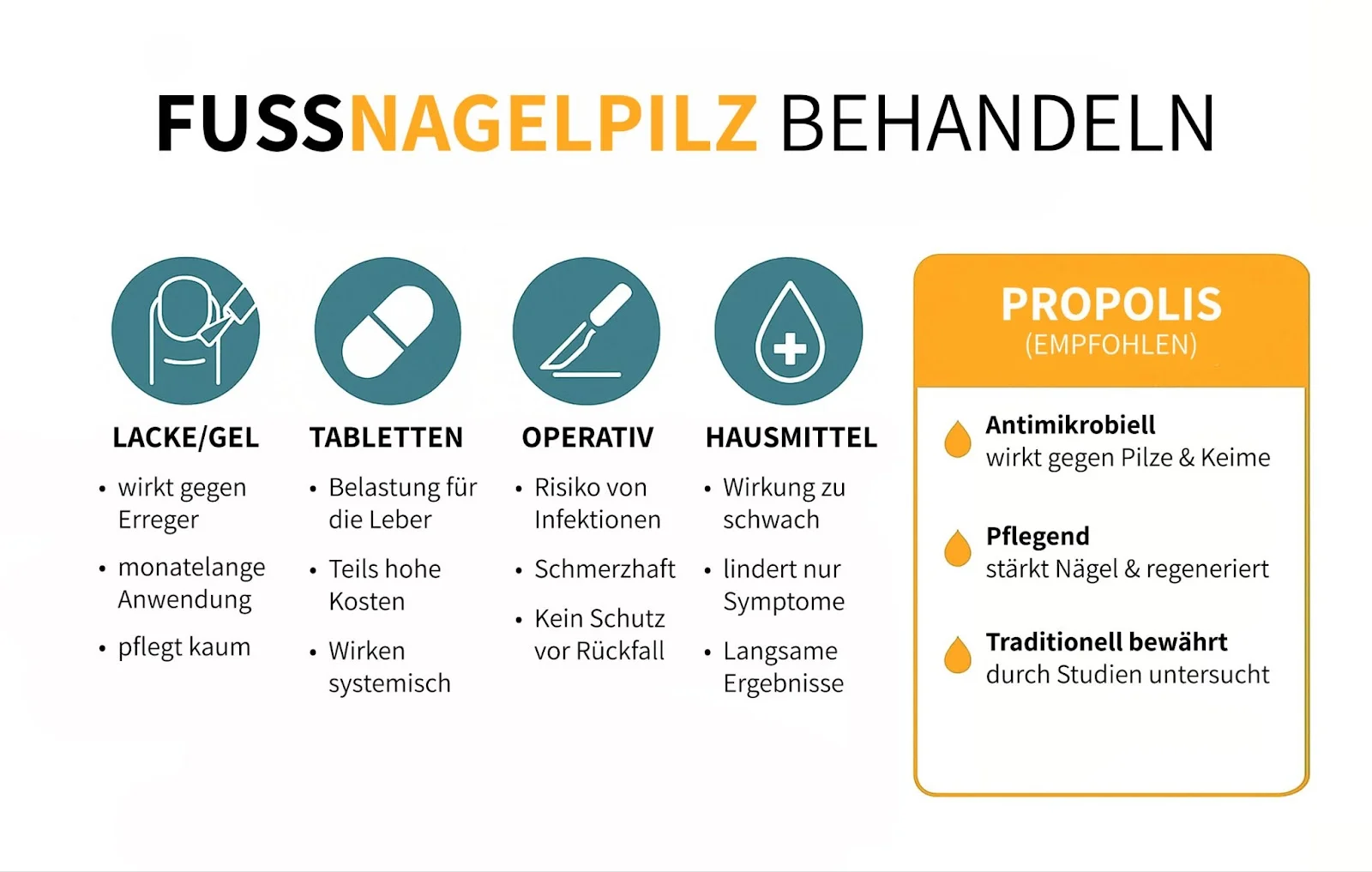 Damit bietet Propolis einen doppelt nachhaltigen Ansatz: Es bekämpft die Pilzerreger zuverlässig und sorgt gleichzeitig dafür, dass die Nägel wieder kräftig, glatt und widerstandsfähig nachwachsen. Genau das macht den Unterschied zu herkömmlichen Tinkturen oder Lacken, die zwar Symptome bekämpfen, aber weder die Ursache noch die Regeneration berücksichtigen.