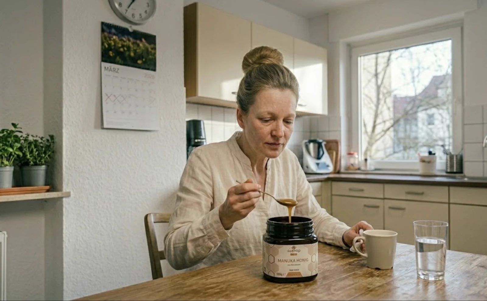 Jeden Morgen dasselbe Ritual: Einen Teelöffel Manuka-Honig, direkt vom Löffel, pur, vor dem Frühstück. Paul hatte in seinem Leitfaden ausdrücklich darauf hingewiesen, keinen heißen Tee zu verwenden, Hitze baut die bioaktiven Verbindungen ab. Also einfach so. Löffel ablecken, kurz stehen lassen, langsam schmelzen lassen.