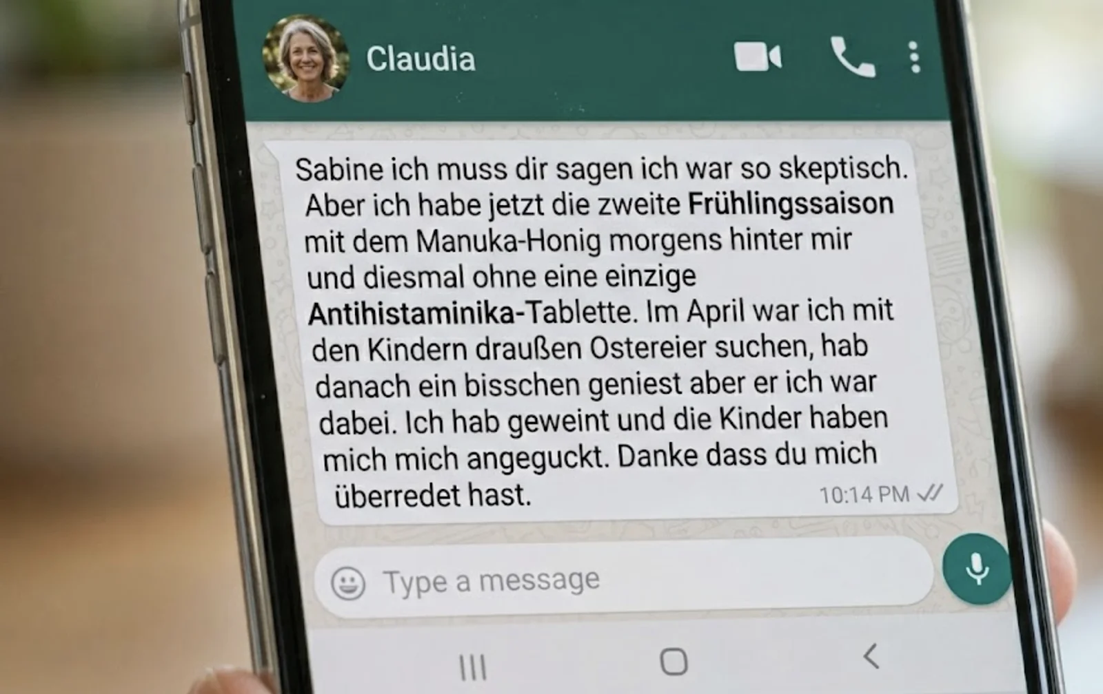 "Es geht nicht um Hausmittel, Mama. Es geht um Methylglyoxal. Und warum das Zeug, das dieser Imker hat, im Körper anders wirkt als alles andere, was du je probiert hast."