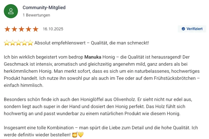 Der bedrop Manuka Honig MGO 500+ ist auf Amazon Bestseller in seiner Produktkategorie. Das ist keine Selbstauszeichnung. Das ist ein Algorithmus, der ausschließlich auf Verkaufszahlen und Kundenzufriedenheit basiert. Wer dort oben steht, hat es sich durch echte Käufer erarbeitet.