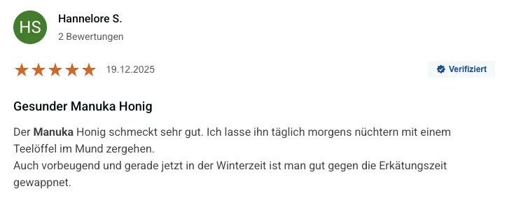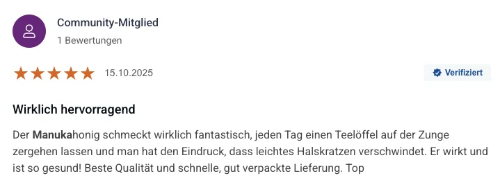 Manuka-Honig ist kein Medikament und macht keine Heilversprechen. Er kann das Immunsystem unterstützen, die Schleimhäute stärken und entzündungshemmend wirken. Für manche Menschen führt das zu einer spürbaren Verbesserung der Allergiesymptome, für andere weniger. Die besten Ergebnisse berichten Menschen, die 6 bis 8 Wochen vor Beginn ihrer Saison mit der Einnahme beginnen und diese konsequent fortführen.