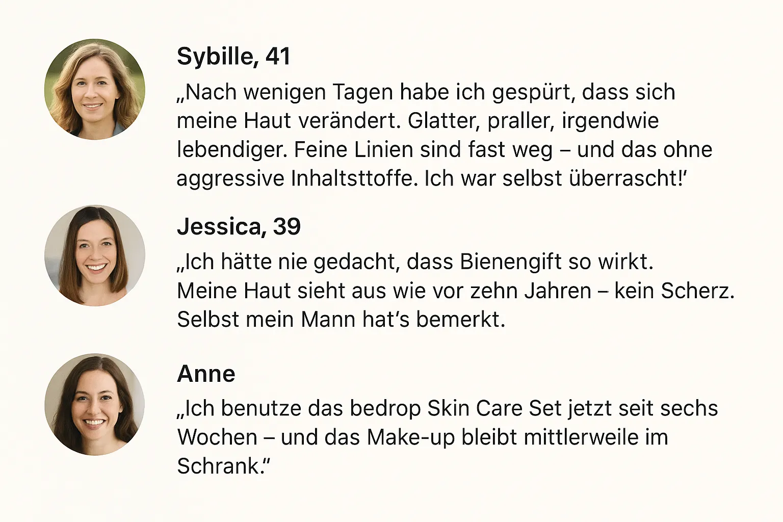 Jegliche Ähnlichkeiten mit realen Personen, lebend oder verstorben, tatsächlichen Ereignissen oder spezifischen Ergebnissen sind rein zufällig und unbeabsichtigt. Die tatsächlichen Ergebnisse der Produktanwendung können variieren und hängen von zahlreichen Faktoren ab, einschließlich der individuellen Anwendung, der Gesundheit und anderen Bedingungen. bedrop garantiert keine spezifischen Ergebnisse und empfiehlt, bei gesundheitlichen Bedenken immer den Rat eines qualifizierten Arztes einzuholen.